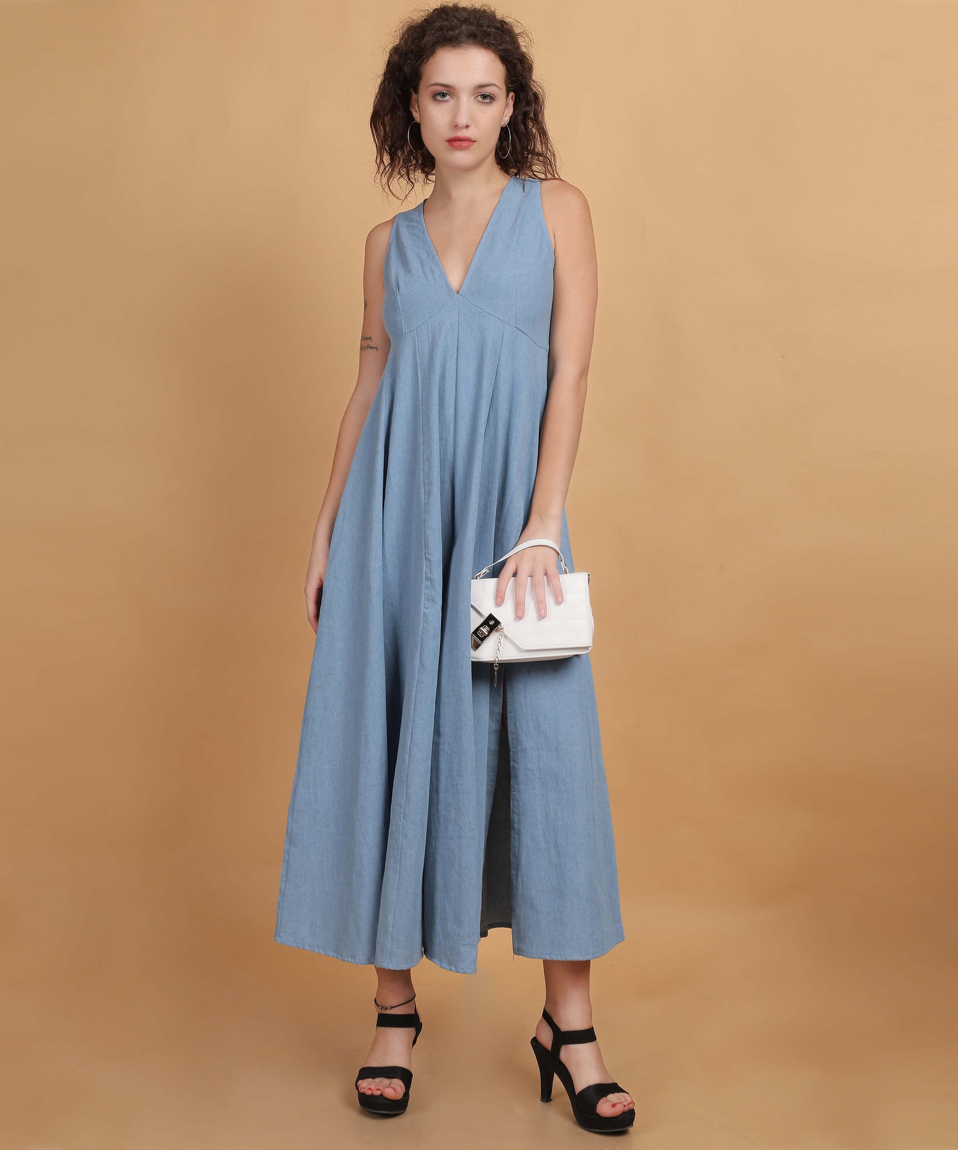 Description: Effortlessly elegant, the denim Sleeveless Maxi Dress is your perfect go-to for minimalist style with maximum impact. This sleeveless dress features a V-neckline and a relaxed, flowy silhouette that allows for graceful movement. The soft, airy fabric and the subtle front slit add a modern touch, ensuring comfort and chicness in equal measure. Its versatile white hue makes it ideal for layering or wearing as a statement piece.