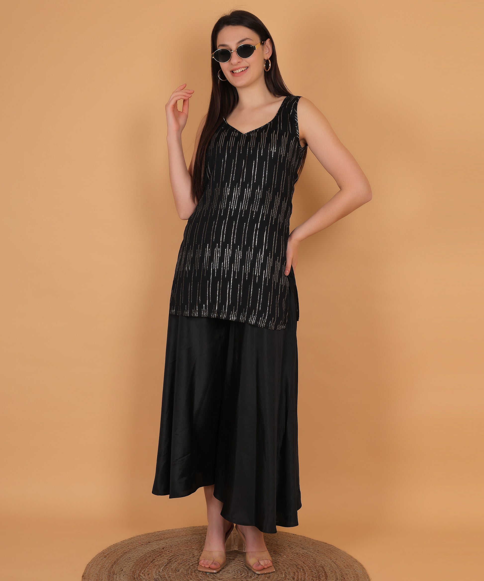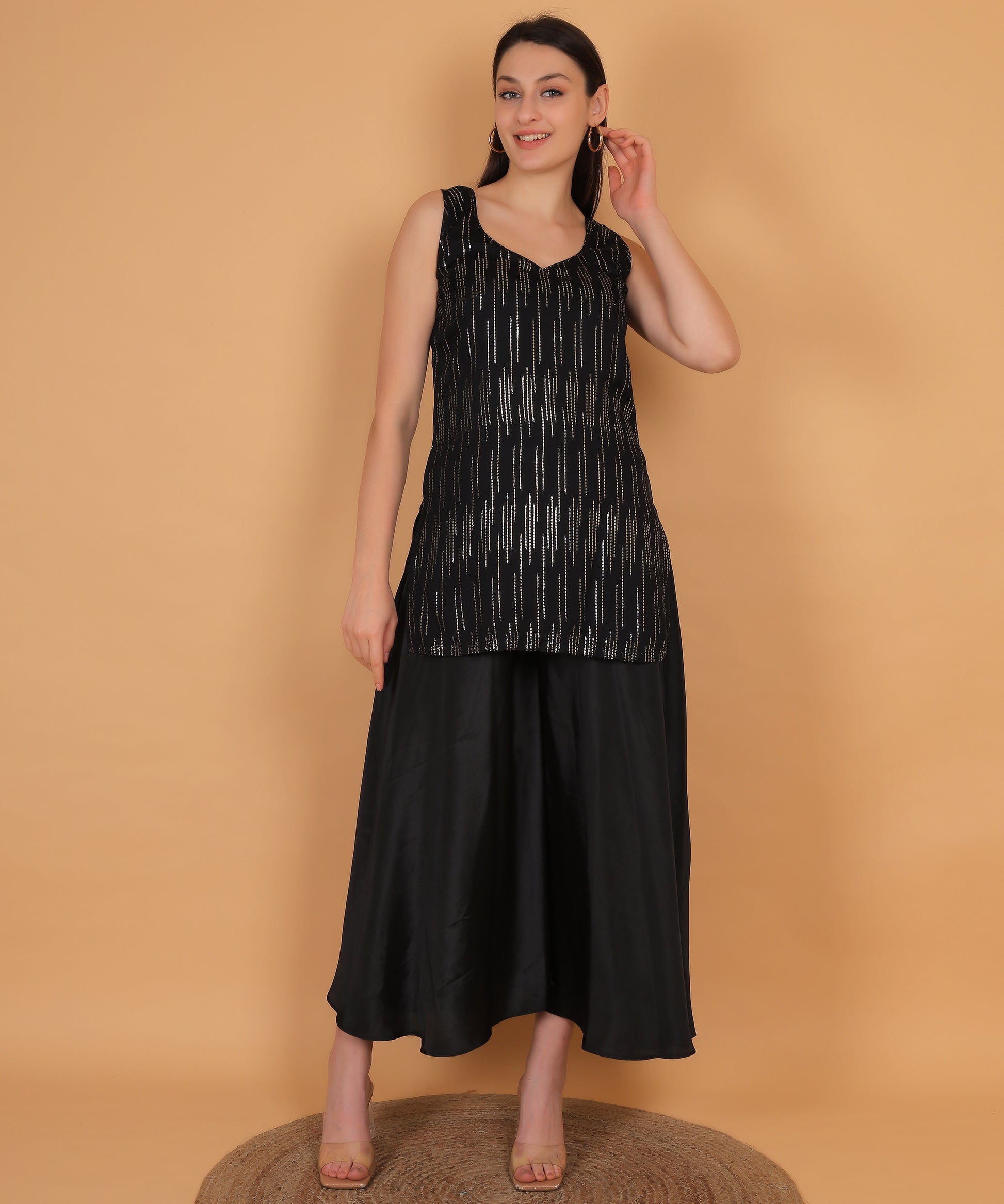sparkle. Paired with flowy wide-leg palazzo pants, this set offers fluid movement,