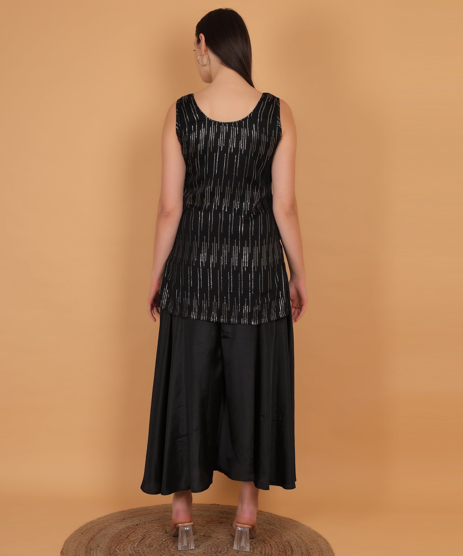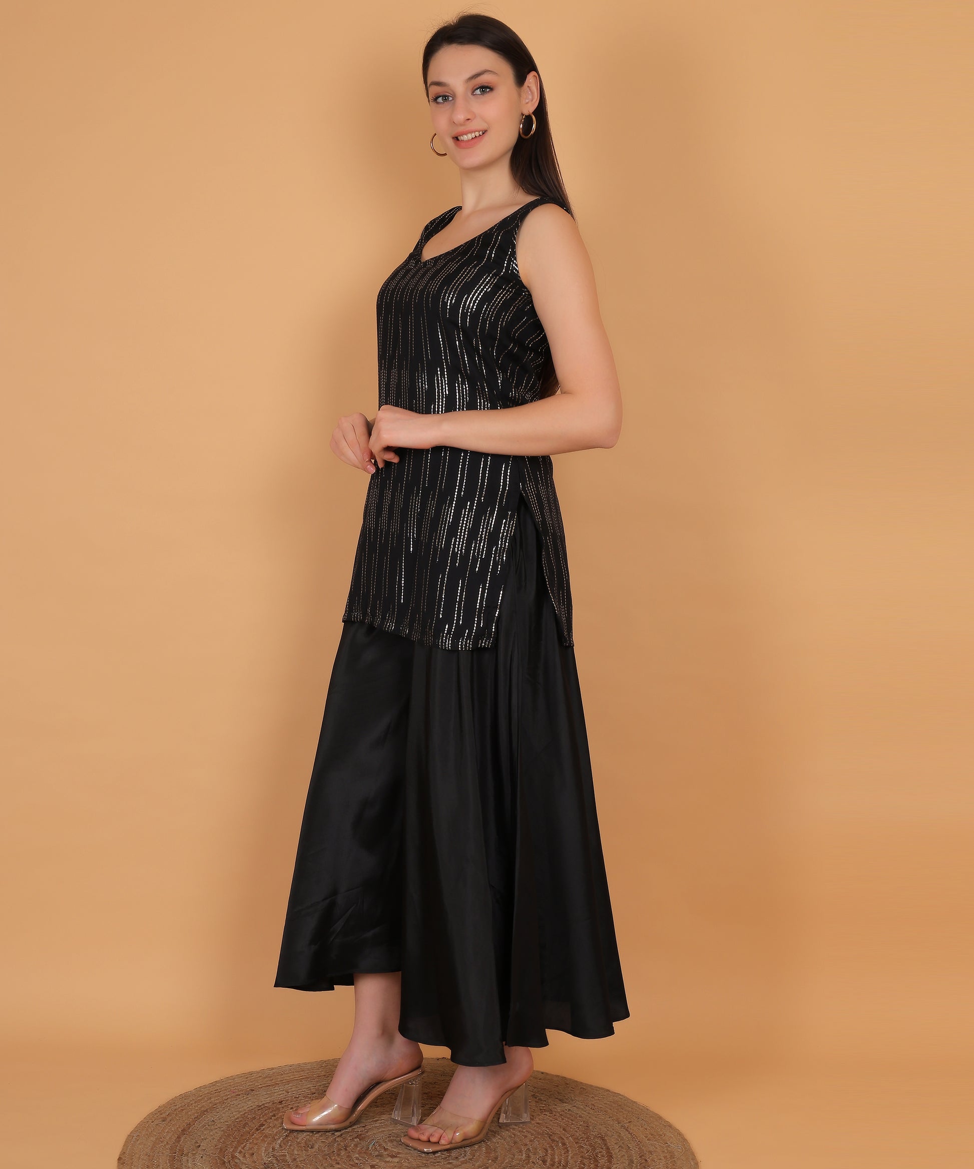 Sleek, radiant, and effortlessly stylish — Stella is a black shimmer kurta set designed