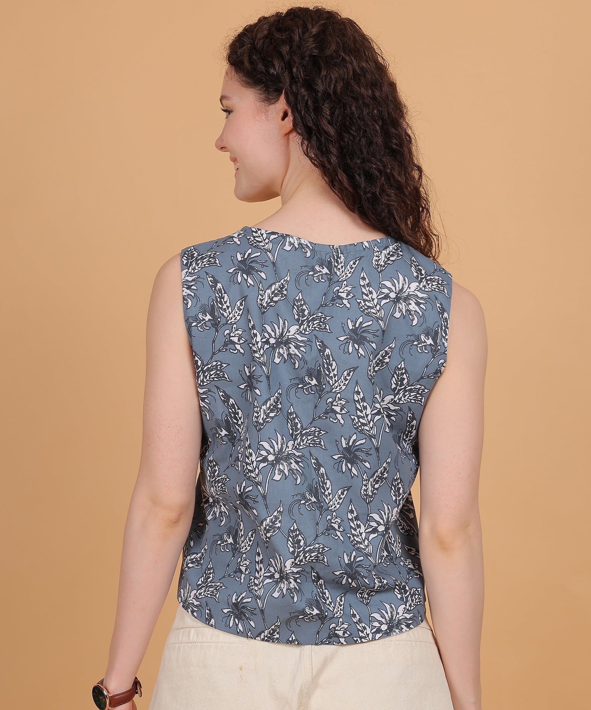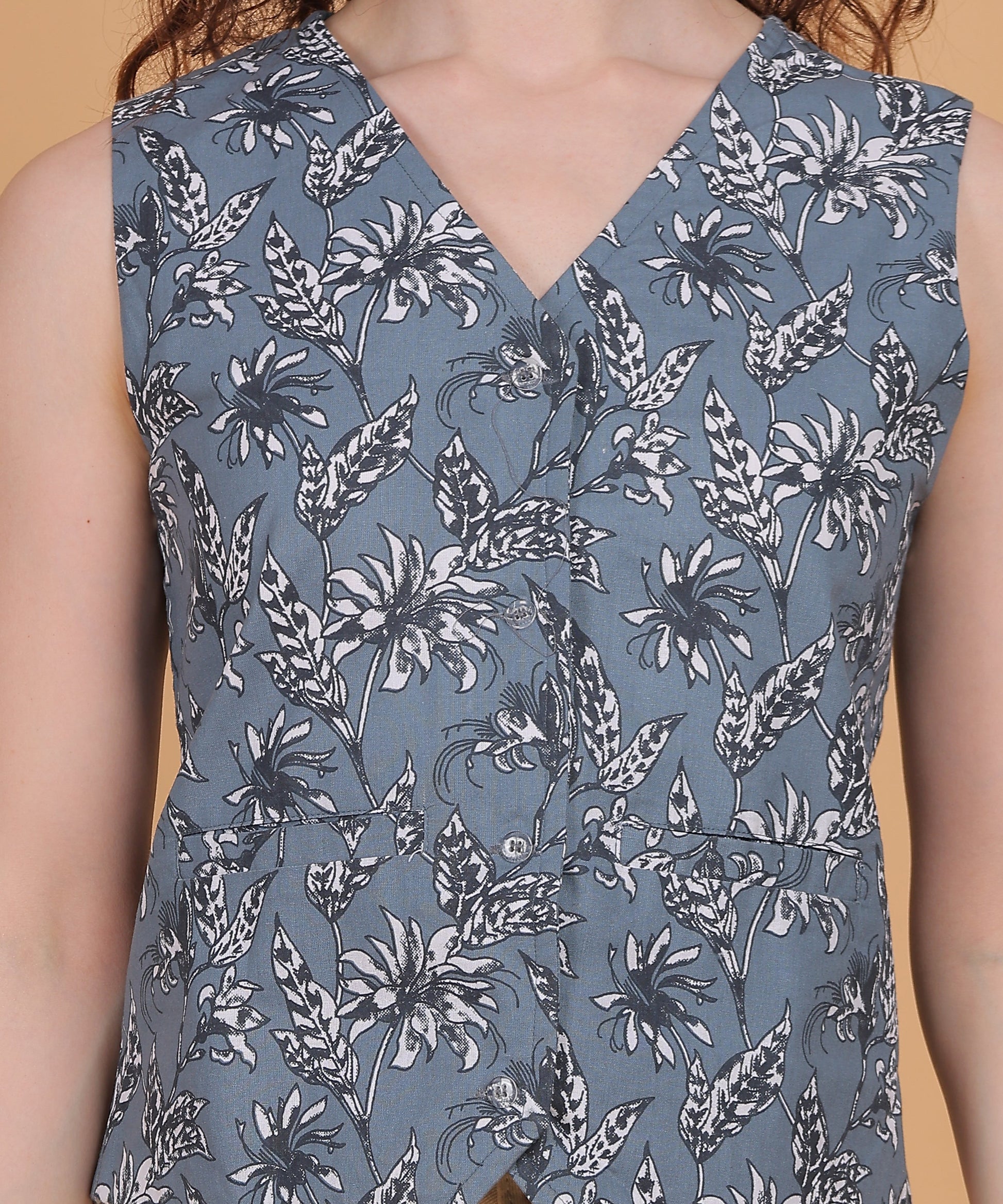 Soft grey-blue base with white & black floral block print