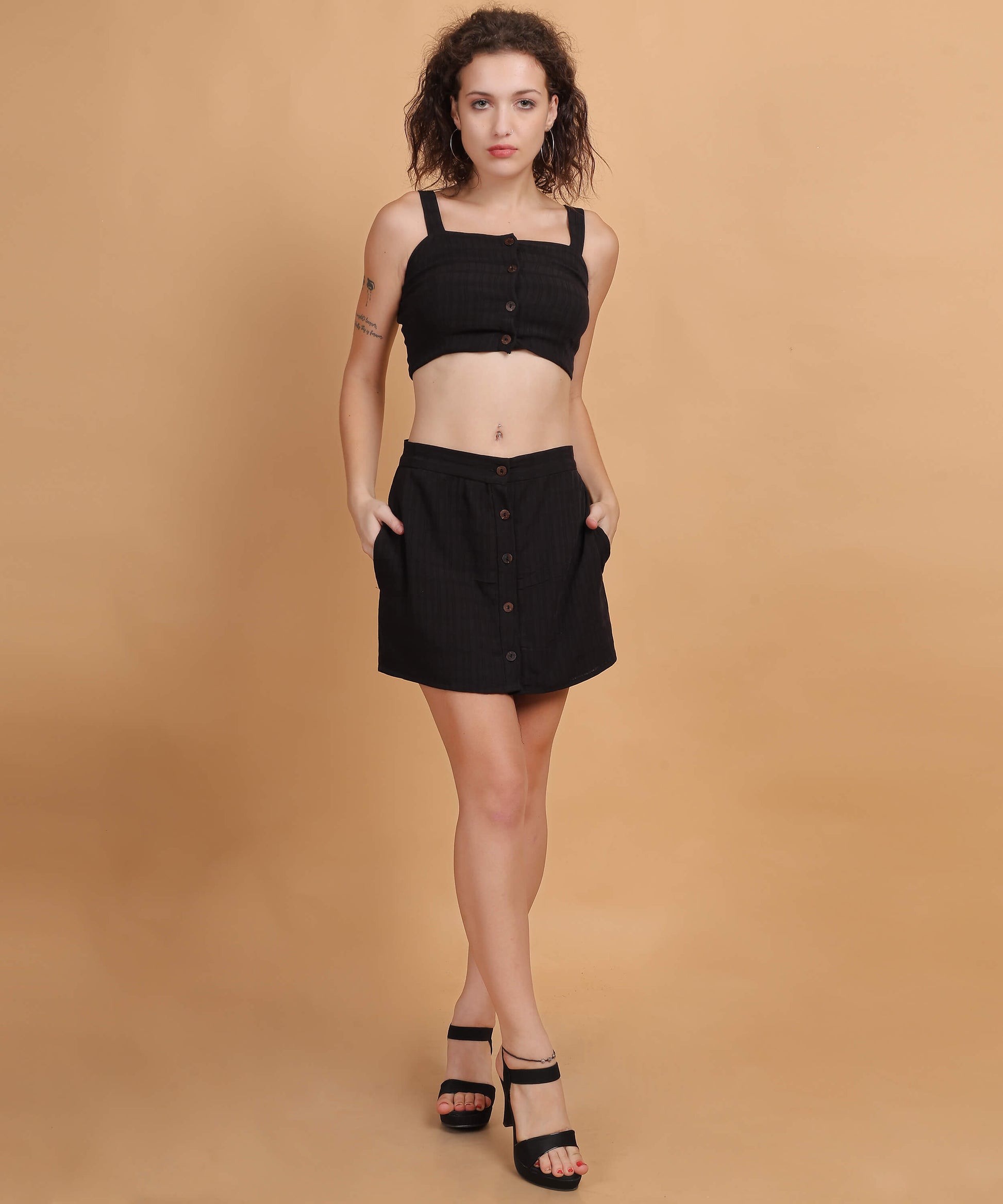 Description: Elevate your style with this chic and versatile co-ord set featuring a sleek black button-down crop top and a matching mini skirt. The top boasts wide straps and a square neckline, adding a touch of structure and sophistication, while the front button closure provides a modern edge. The matching skirt is high-waisted with a buttoned front, offering a cohesive, effortlessly stylish look. Crafted from lightweight and breathable fabric, this set is perfect for casual outings, brunch dates, or even summer vacations. Pair it with heels for a classy look or dress it down with sneakers for a laid-back vibe.